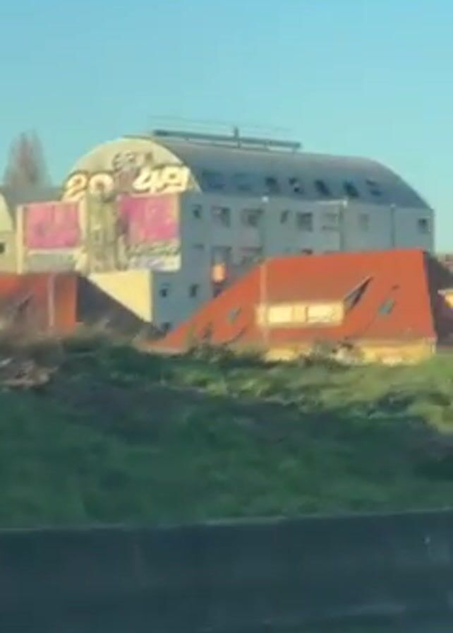 The camera, presumably mounted in a moving vehicle, provides a roadside view of a cityscape under a clear, blue sky. The buildings vary in style and color, ranging from modern apartments covered in graffiti to older brick structures with wrought-iron balconies. In the foreground, a concrete barrier separates the road from a grassy area. Trees, many bare of leaves, punctuate the scene. The overall impression is of a bustling, perhaps slightly aged, urban area.