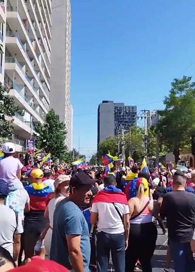 large crowd of people gathered in what appears to be a protest or demonstration. Many are waving or wearing Venezuelan flags. The crowd is dense, with individuals of various ages and ethnicities visible. Some people are filming with their phones. The scene is outdoors, on a city street lined with tall buildings and trees. The sky is clear and blue. There is a light pole with many wires attached to it. A sign for a burger restaurant is visible. The atmosphere appears energetic and potentially politically charged.