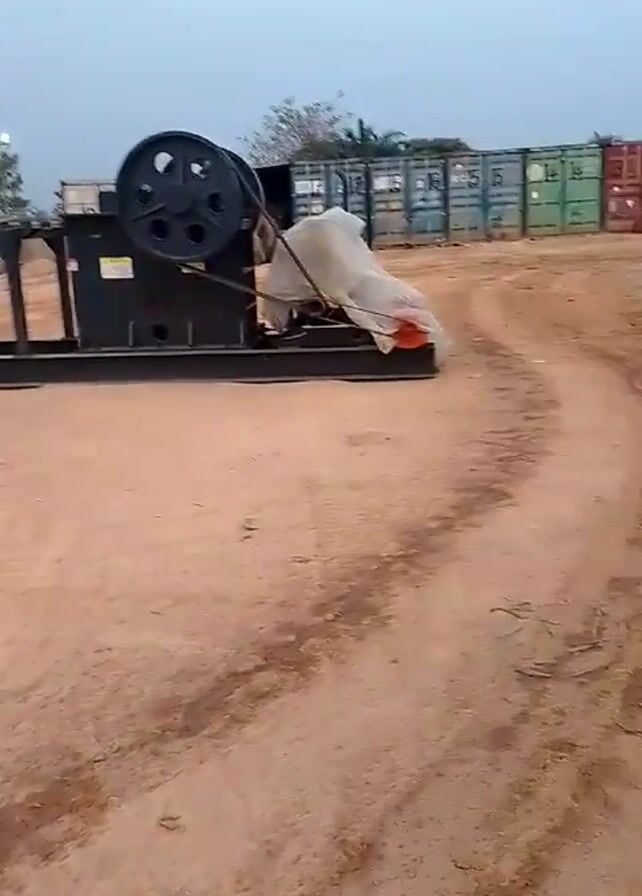 wide, open dirt lot, possibly a construction site or industrial yard. The ground is reddish-brown and shows tire tracks. A large, dark-colored machine with a wheel is visible to the left. In the background, a row of stacked shipping containers in various colors are visible. A few palm trees and a pile of earth are visible further back. The sky is overcast and the lighting is dim. The video is shaky, indicating it was taken by hand. The lower-left corner of the video displays the text "itel P40 4G".
