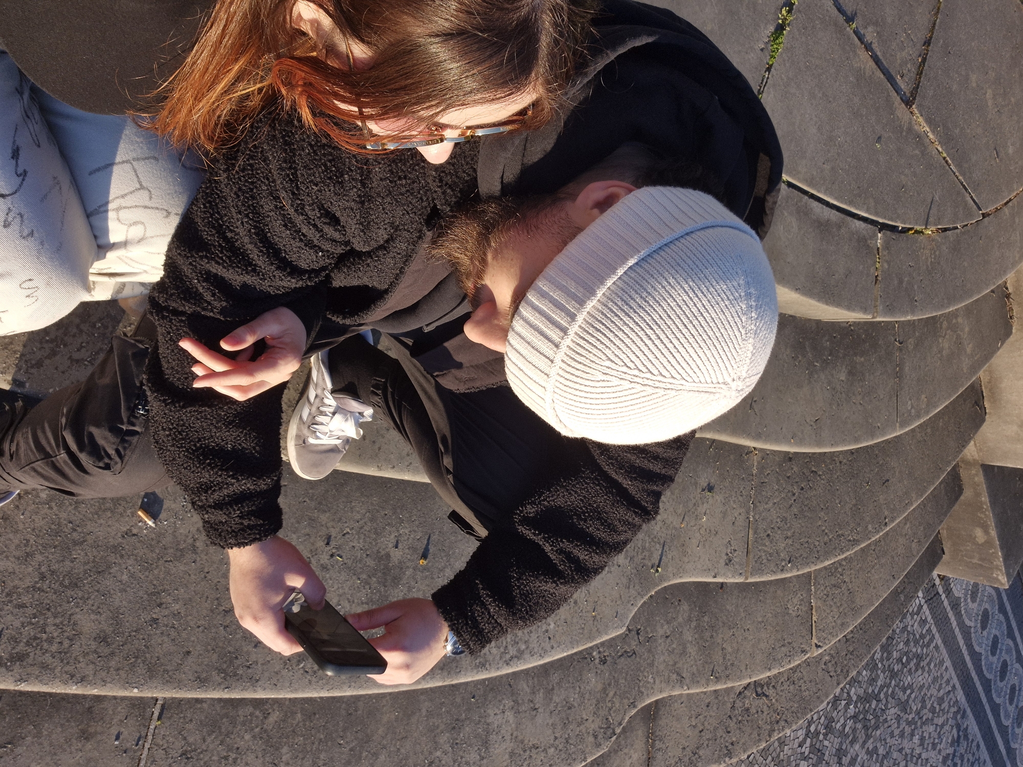 The scene depicts two individuals seated on weathered, curved gray stone steps at the Pont Saint-Nicolas in Strasbourg, France. A male subject, identifiable by his beard and a light gray ribbed beanie, occupies the right side of the frame. He wears a black hooded jacket, a black textured outer layer, black pants, and light gray sneakers. He holds a black smartphone in his right hand, appearing to observe its screen; a silver-toned watch is visible on his left wrist. Adjacent to him on the left is a female subject with reddish-brown hair and gold-framed glasses, dressed in a black textured top and light-colored pants. Strong, directional sunlight illuminates the subjects and casts shadows across the steps, where a single discarded cigarette butt is visible on the surface. In the upper right background, a distinctive mosaic pavement featuring interlocking gray circular patterns is discernible.