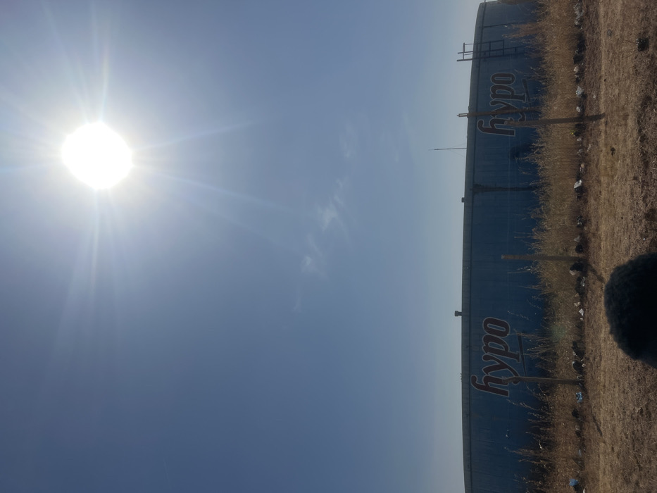 The image displays a large, light-blue cylindrical storage tank, prominently labeled with the word "hypo" in stylized red letters, situated in Kwang, Nigeria. The tank is positioned behind a rudimentary fence constructed from wooden posts and wire. The foreground consists of dry, brown earth interspersed with patches of light-brown, tall grass and scattered debris. The upper portion of the frame is dominated by a clear, bright blue sky, with a brilliant, luminous sun casting rays from the upper-right quadrant. A few faint, wispy white clouds are visible in the sky. A dark, indistinct object partially occupies the bottom-center of the frame. No individuals are visible, and no actions or interactions are discernible.