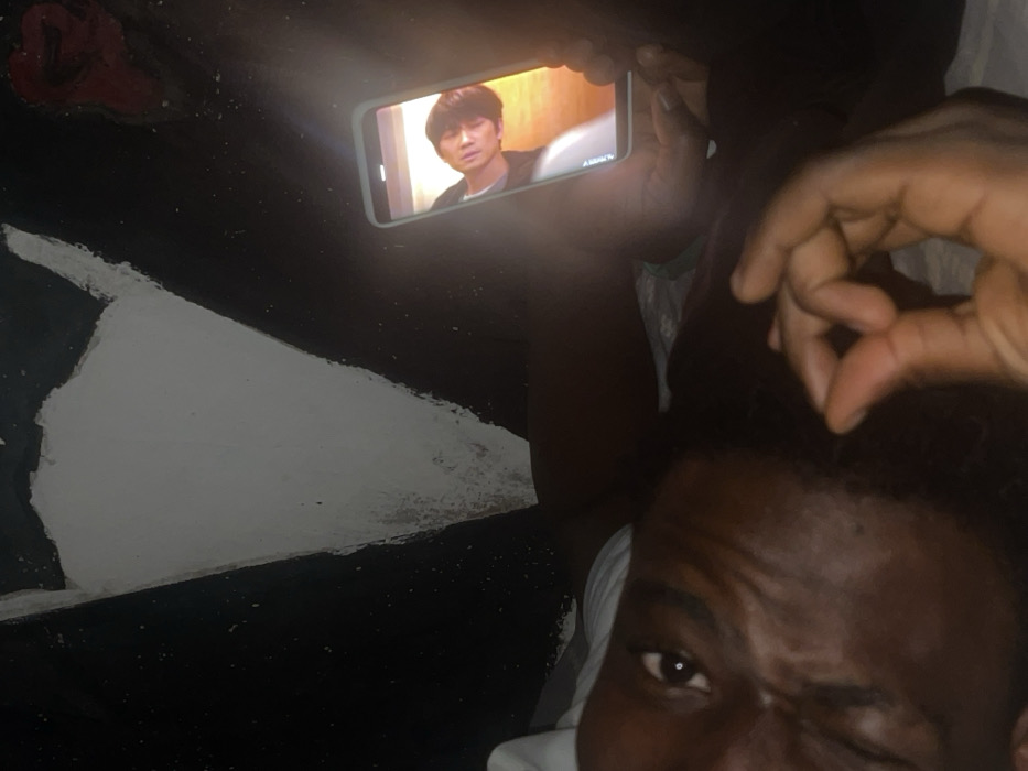 The scene is an interior, dimly lit environment in Uturu, Nigeria. The background consists of a dark wall partially covered by rough, irregular patches of white paint, with a faint red mark visible on the upper right. In the foreground, a person with dark skin is lying on a surface, positioned with their head angled to the left, looking directly towards the camera. They are wearing a white garment. Their right hand is raised, forming a circle with the thumb and index finger, indicating an "OK" gesture. To the right, a second individual, largely obscured, holds a light-colored smartphone vertically. The phone's screen is brightly illuminated, displaying a depiction of a young male with brown hair looking slightly upwards and to the left, against a vibrant orange and yellow background. The intense glow from the phone screen is the primary light source in this section of the image, casting light on the hands holding the device. Both individuals appear to be resting on a patterned surface.
