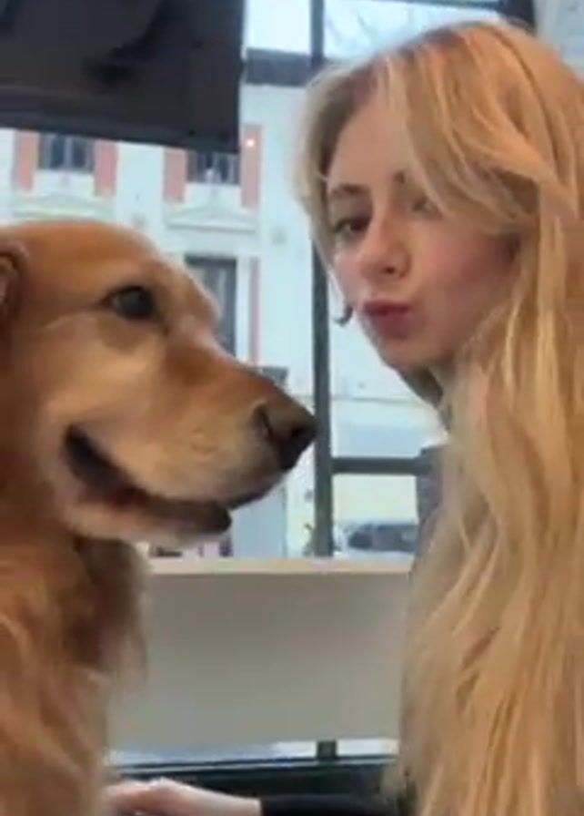 A young woman with long blonde hair is seen in profile, facing a golden retriever, at close range, possibly indoors. The woman puckers her lips in a kiss-like gesture toward the dog. The dog licks its nose and mouth. The woman then smiles at the camera. In the next shot, the woman is smiling and hugging the dog. A window is visible in the background.