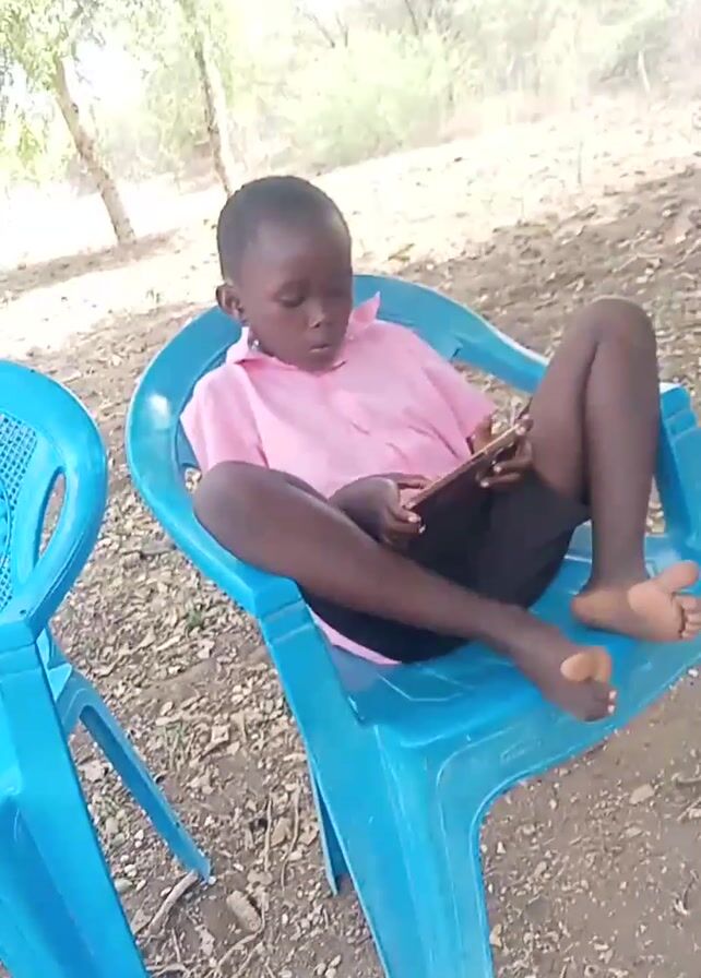 A young, dark-skinned person is sitting in a blue plastic chair. The person is wearing a pink shirt and black shorts. Their bare feet are resting on the chair's back. The person is looking down at a mobile phone they are holding in their hands. The chair is on the ground in an outdoor area with dirt and some foliage visible. Another blue plastic chair is partially visible nearby. A foot wearing a light blue sandal is partially visible in the upper right corner of the frame.