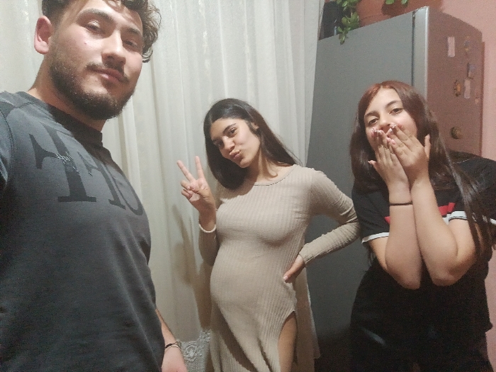 This image captures three individuals indoors, in what is stated to be a residential setting in Roman, Bulgaria. On the far left, a male is positioned close to the camera, with his torso cropped from the chest down. He has dark curly hair and a beard, and wears a dark grey t-shirt featuring a lighter-toned graphic design. His gaze is directed towards the camera. In the center stands a female, visible from mid-thigh up. She has long, dark hair and is wearing a form-fitting, light beige ribbed long-sleeved dress that accentuates a visible pregnancy. Her right hand is raised in a peace sign gesture, her left hand rests on her hip, and her lips are pursed towards the camera. A white bracelet is visible on her right wrist. On the far right, a second female is visible from the waist up. She has long, dark hair with reddish-brown highlights and is wearing a black t-shirt with white and red striped short sleeves. She holds both hands over her mouth, smiling, and wears a thin black bracelet on her left wrist. The immediate background behind the male and the central female consists of light-colored curtains. To the right, behind the second female, a large, light grey refrigerator is visible, with a potted plant positioned on its top surface and small, light-colored items affixed to its door. The wall in this section of the background is a dark, muted tone. The scene is illuminated by ambient indoor lighting.