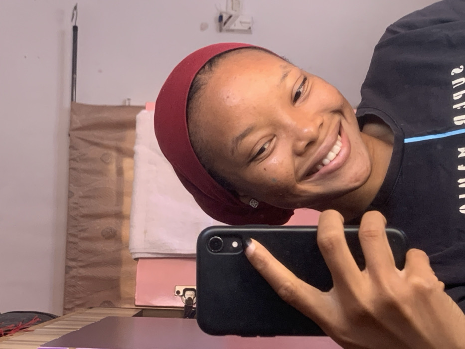 A head-and-shoulders portrait captures a young female, estimated to be in her late teens or early twenties, smiling broadly towards the camera. She has dark skin and is wearing a dark red fabric head covering and a black t-shirt with a light blue vertical stripe and partially visible white text. A small, square, clear stud earring is visible in her left ear. Her right hand, featuring dark nail polish on the thumb, index, and middle fingers, holds a black smartphone with a visible single camera lens and flash on the reverse, angled towards her face, indicating a selfie. The indoor background includes a light pink door or cabinet on the left, a white towel or fabric draped behind her, and a light brown curtain across the upper portion of the frame. A thin black metal rod extends horizontally in the upper center. The specific location within Ilorin, Nigeria, is not discernible from the visual information provided.