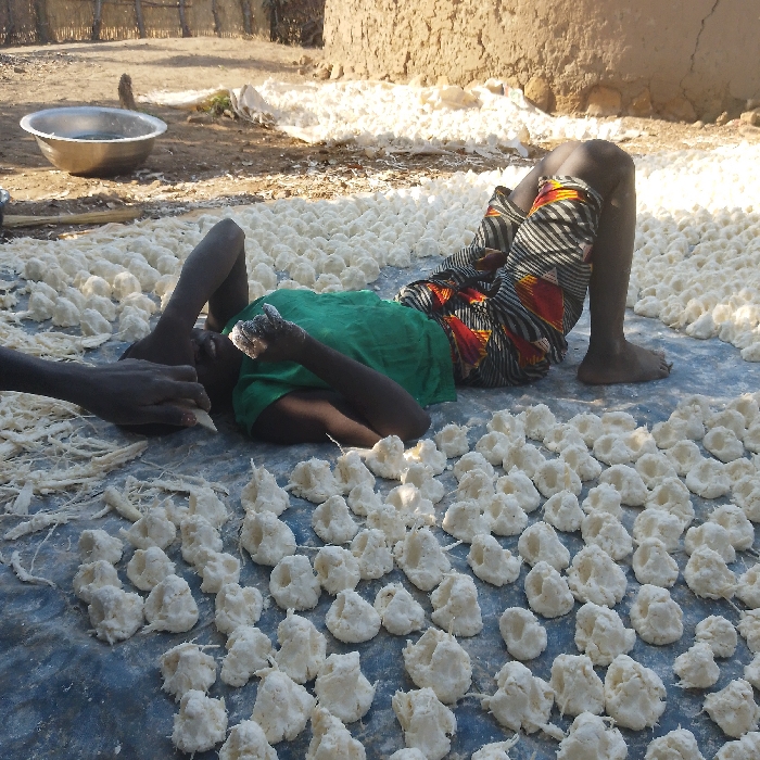 The scene, located outdoors in Sabongari Garkida, Nigeria, depicts an individual lying supine on a blue tarp covered extensively with hundreds of small, white, irregularly shaped, porous clumps