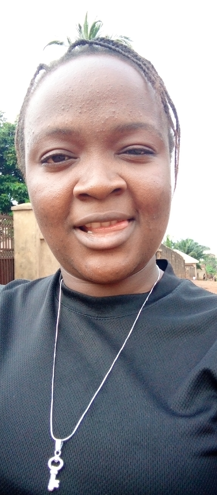 A close-up, head-and-shoulders portrait depicts an individual with dark skin, smiling directly at the camera with their tongue slightly visible. The individual's hair is styled in braids, and a small green leafy plant is positioned atop the head, visible against the bright, overcast sky. They are wearing a black, mesh-patterned, short-sleeved crew-neck shirt and a thin, silver-colored chain necklace with a key-shaped pendant. The background is out of focus. To the left, a light-colored wall and a dark metal gate are partially visible, with green foliage beyond. To the right, distant light-colored structures and dense green vegetation, including palm fronds, are present. The scene is an outdoor setting in Ukwu-Abwa, Nigeria.
