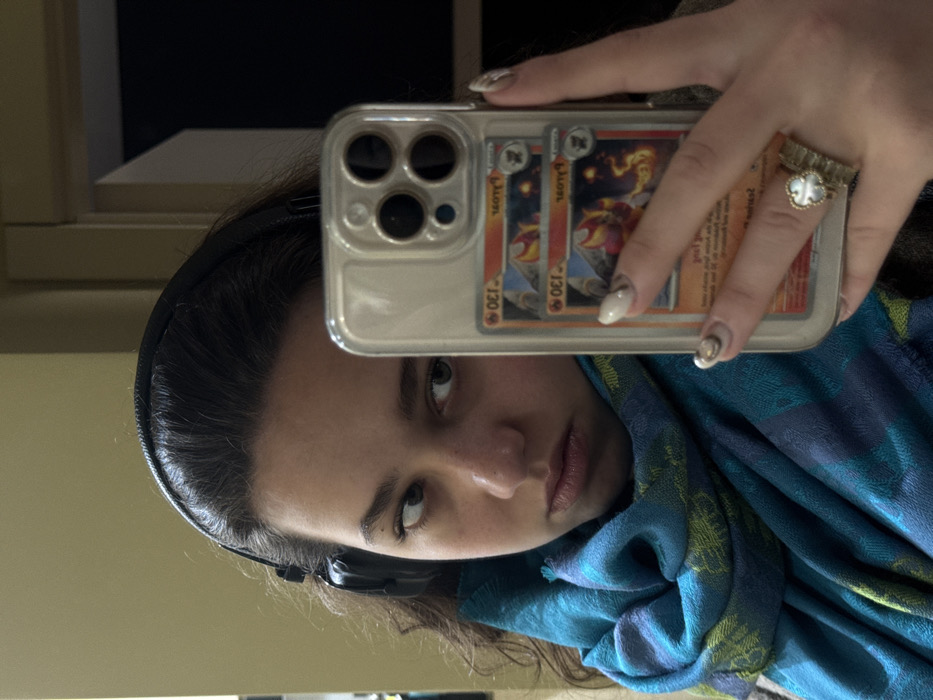 A half-body mirror selfie depicts a young woman in an indoor setting in Sofia, Bulgaria. She has dark, wavy hair and wears black over-ear headphones. Her expression is direct and unamused. She is dressed in a teal and blue patterned scarf wrapped around her neck and shoulders. Her left hand, adorned with white fingernail polish featuring black swirl designs, holds a silver-colored smartphone encased in a clear protective cover. Two rings are visible on her left ring finger: one with a white clover-shaped motif and another with multiple rectangular facets. Visible behind or reflected through the clear phone case are two vertically stacked Pokémon trading cards, featuring an Infernape image with reversed text displaying "130" and "HP". The background shows a plain light beige wall to the left and a dark interior doorway or opening to the right.