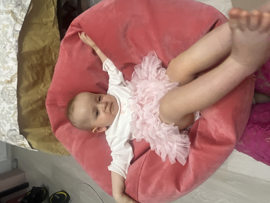 A baby lies on a large pink beanbag chair, wearing a white, long-sleeved bodysuit with a pink ruffled tutu. The baby's legs are bent, with bare feet visible. One arm is extended upward, while the other is stretched to the side. The beanbag sits atop a light-colored floor. Parts of a patterned curtain, a green or gold fabric, and shoes can also be seen.