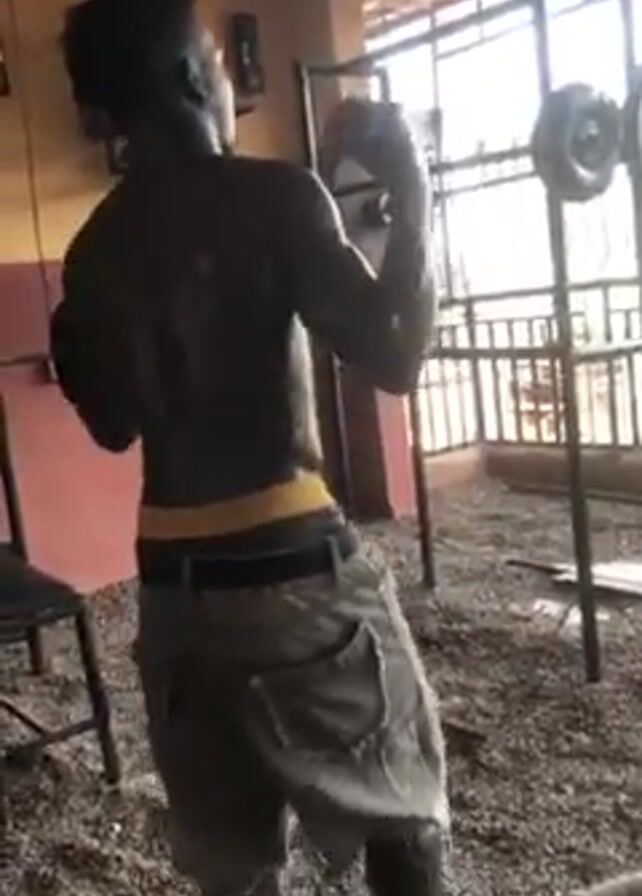 A shirtless man wearing camouflage shorts is dancing in an indoor gym. He is facing away from the camera at first and then turns to his left. The gym equipment is rustic and includes a squat rack with weights. The floor is covered in debris. There is a chair and what looks like a stereo in the background. Outside the open porch there is a fence visible. Loud music plays in the background.