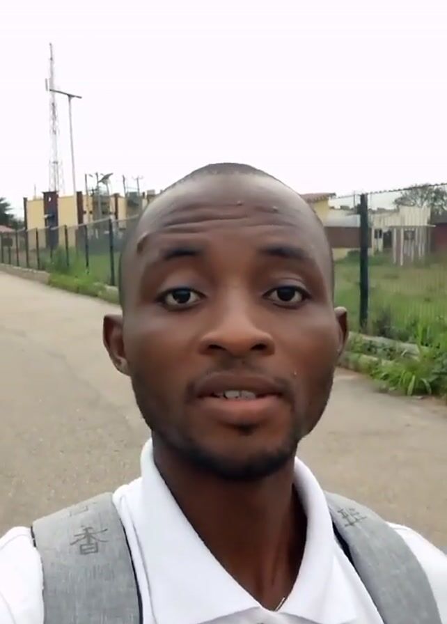 man wearing a white polo shirt and a gray backpack looking directly at the camera. He is on a paved road that has a fence on either side. There is greenery behind the fence. A communications tower is visible in the distance. The sky is overcast. The man says, "It's a brand new day. Going to work. Good morning, everyone."