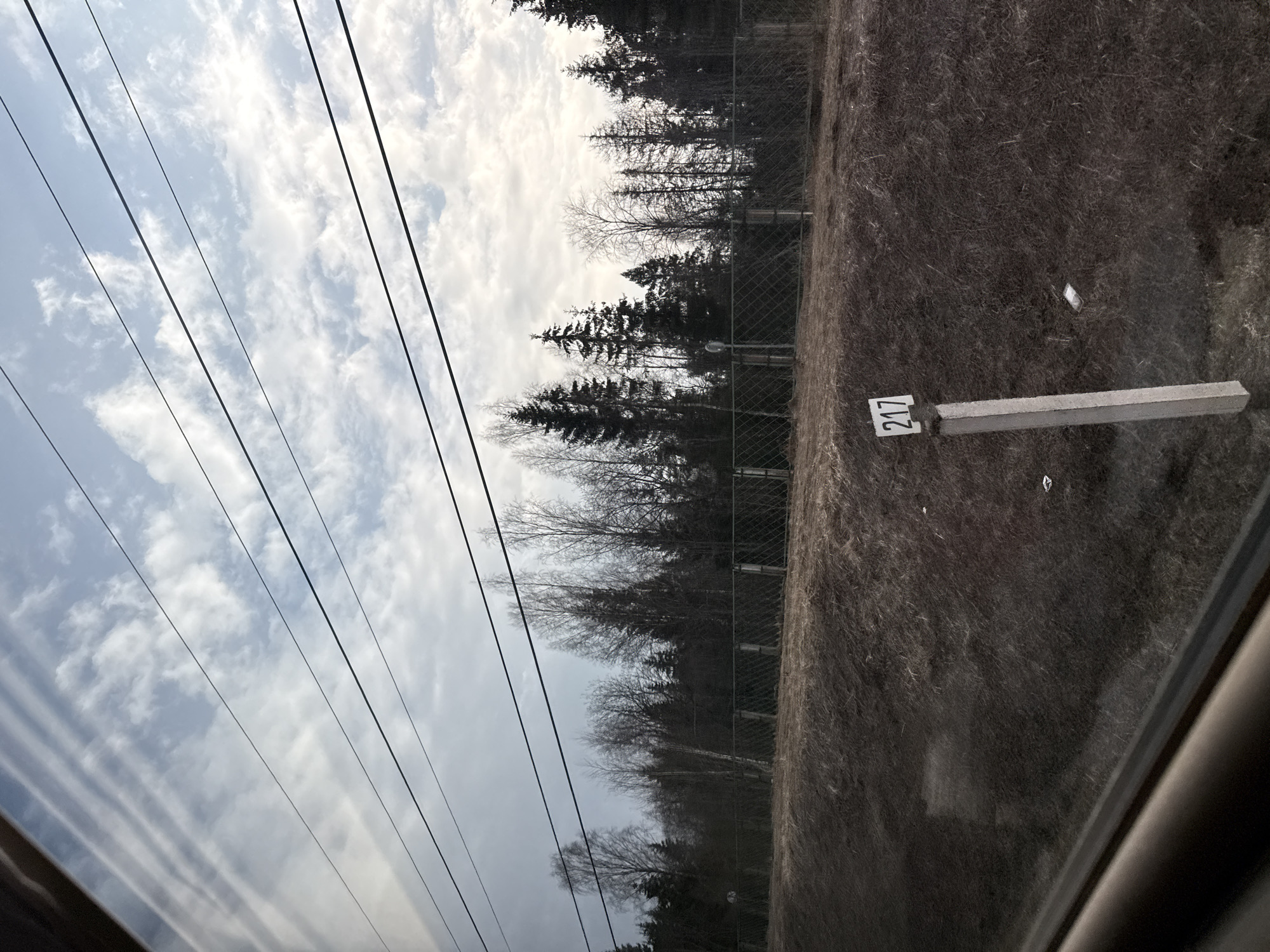 A low-angle shot from inside a moving vehicle presents a view of Торбино, Russia. Outside the window, a sky with scattered clouds is traversed by electrical wires. Adjacent to the road or track, trees of varying heights create a forested edge, bordered by a chain-link fence. The foreground features a marker with the number "217". Beyond the fence is rough, brown vegetation. The reflection in the window shows the vehicle's interior.