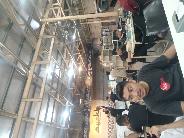 An indoor scene depicts a bustling area with multiple people seated at tables. The space features a high ceiling with exposed structural beams and hanging fans. Arabic script adorns the wall, adding a cultural element to the environment. Several individuals are visible, some engaged in conversation and others seemingly posing for a photo. A mix of clothing styles is observed, suggesting a casual atmosphere. The overall setting appears to be a cafeteria-style or communal eating area.