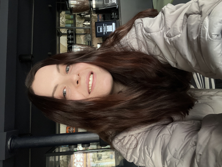 The image presents a close-up, frontal portrait of a female subject inside Café Hannes in Meisenheim, Germany. The subject has long, dark brown hair, blue eyes, and fair skin, and is smiling directly at the camera with her teeth visible and tongue slightly protruding. She wears a light gray quilted puffer jacket, partially revealing a black and white striped garment underneath at the zipper line. The background details a coffee shop interior. To the subject's upper left, a dark structural pillar is visible. Further left, through a window or glass partition, blurred architectural elements of an exterior building can be discerned. To the right, a counter features clear dispensers filled with coffee beans, a digital display screen exhibiting German text ("Bewerben Sie unseren Onlineshop", "Nachhaltigkeit zum fairen Preis") and a QR code, and shelves stocked with assorted cafe merchandise, including a visible "Chocolat" labeled tin. The environment is characterized by a dark ceiling and commercial coffee service equipment.