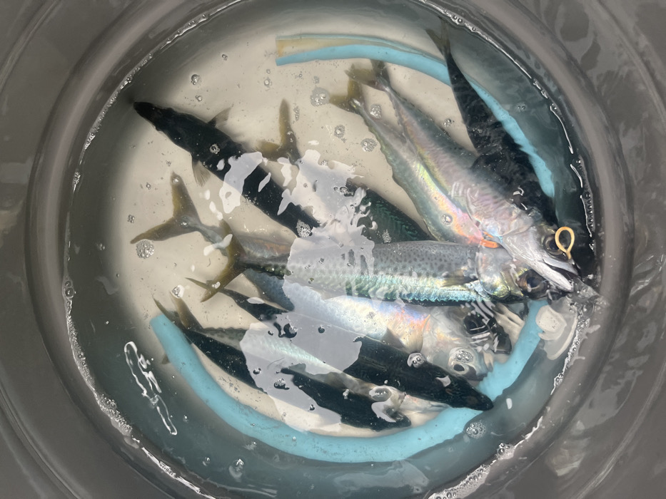 This forensic description pertains to a scene located in Bellambi, Australia. The image depicts an overhead view into a round, gray bucket or container, which holds a quantity of clear water. Submerged in the water are approximately ten to twelve small, deceased fish, appearing to be baitfish such as pilchards or small mackerels, varying in size. Their bodies exhibit typical fish coloration: dark blue-green to black on their dorsal sides, transitioning to iridescent silver or white on their ventral sides. Several fish display distinct spotting patterns along their flanks. The tails of many fish are visible, generally having a yellowish-brown hue. A light blue, flexible, tube-like object is partially coiled around the inner circumference of the bucket, submerged with the fish. Near the bottom right of the frame, a small, gold-colored, U-shaped metal object, resembling a fishing hook or clip, is visible and appears to be attached near the mouth of one of the fish. The water surface shows minor bubbles. No human subjects are present.