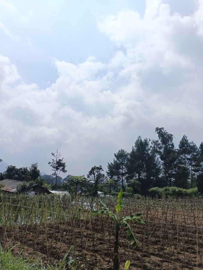 The image presents an agricultural landscape in Ea Tê, Vietnam, under a bright, partially cloudy sky. The upper two-thirds of the frame feature a light blue sky with significant coverage of white cumulus clouds. The lower third displays a cultivated field of brown earth, traversed by numerous vertical stakes made of wood or bamboo, arranged in rows. A young banana plant with bright green leaves stands prominently in the lower-middle foreground. Sparse green grass is visible along the bottom edge on the far left. In the midground, green plants are observed growing on the support stakes. Several small structures with corrugated metal roofs are partially visible on the far left, behind the cultivated area. The background consists of a dense treeline, featuring tall, dark green coniferous trees on the right and various deciduous trees further left, with indistinct, hazy mountains or hills visible on the distant horizon. No people are present in the scene.