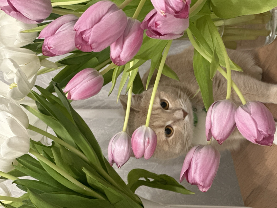 An indoor scene, possibly located in Nekrasovskiy, Russia, features a light tan-colored domestic shorthair cat with amber eyes and a green collar. The cat is positioned on a light brown wooden surface, partially obscured by two bouquets of tulips. Numerous white tulips with green stems are visible in the upper left quadrant of the frame. A separate arrangement of pink tulips, some with prominent green stems, dominates the right side and foreground, with some appearing to be in a clear glass vase visible in the lower right. The cat's head and upper torso are visible through gaps between the pink tulip stems, and it is looking forward with a focused gaze. The background consists of a textured white wall or curtain.