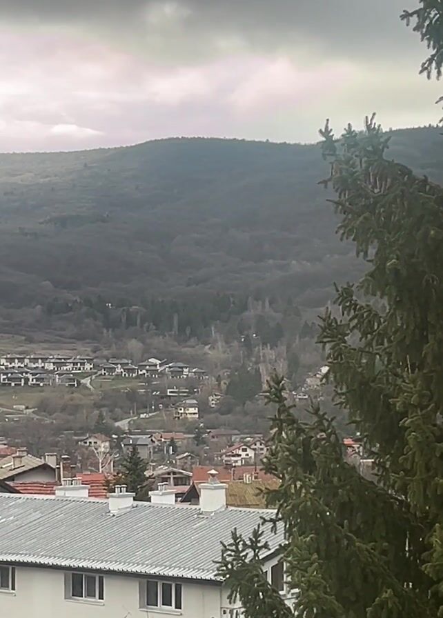town nestled in a valley, surrounded by tree-covered hills. The sky is overcast with dark clouds. In the foreground, the roofs of buildings are visible, including one with a white exterior and a grey roof. Part of a tall, green evergreen tree frames the right side of the view. The overall scene is calm and quiet. There are no people visible in the frame.