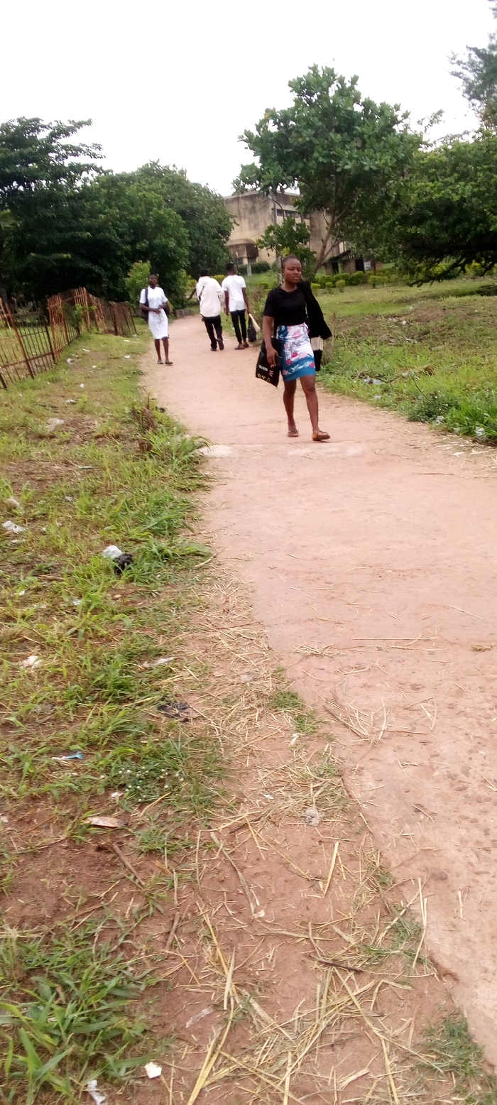 dirt path in a grassy area in Okigwe, Nigeria, located at the coordinates 5.825 latitude, 7.393 longitude. The path runs diagonally from the left side of the image to the right, with a black metal fence on the left side. There are five people walking on the path, all wearing casual clothing. One person is a young woman, who is wearing a black top and a colorful skirt. She is carrying a black bag over her shoulder. The other people are four young men. Three are wearing white shirts and pants, and one is wearing a blue shirt and black pants. The people are walking away from the camera, towards the right side of the image. The scene is lit by the sun, and the sky is partly cloudy. There are trees in the background, along with a building. There is debris on the ground next to the path. There is green grass on either side of the path, and there is dry grass and leaves on the ground next to the path. The scene is set in a public park, with a fence separating the park from an adjacent road.