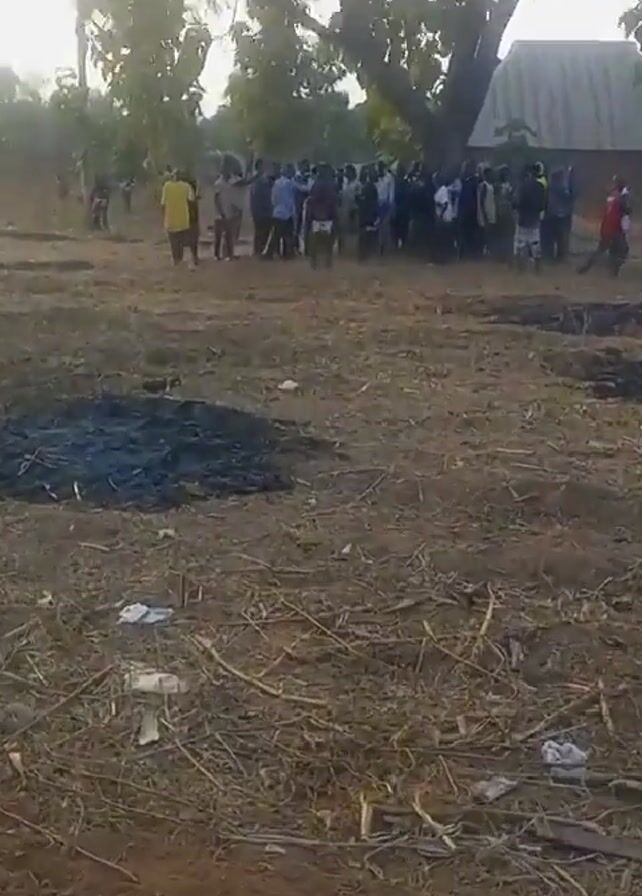 group of people gathered in a dusty, open area with sparse vegetation and a large tree in the background. Some of the people are standing around, while others are engaged in what appears to be a traditional wrestling match or game. There are two participants in the center of the crowd, grappling with each other in the dusty ground. The camera is mostly static, focusing on the wrestling. In the foreground, there are patches of burnt material on the ground, along with scattered debris. The overall atmosphere seems to be one of community and local entertainment.