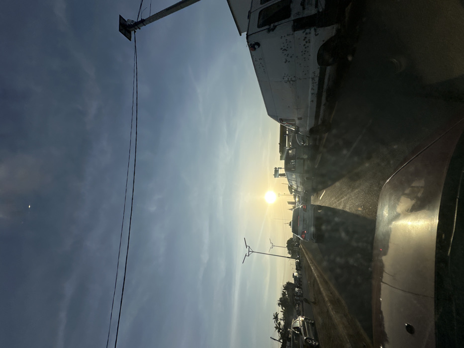 The image captures a road scene in Jos, Nigeria, during either sunrise or sunset, with the bright sun low on the horizon, casting long shadows. A prominent crescent moon is visible high in the sky. The perspective is from inside a vehicle, with its hood reflecting sunlight in the foreground. Traffic is present on what appears to be a multi-lane road. In the left lane, a silver sedan with illuminated taillights is visible, followed by a lighter-colored van. To the right, a white commercial van, heavily weathered with rust and peeling paint, is stationary. Overhead power lines span the upper frame, connecting to a utility pole equipped with a solar panel on the far right. Modern streetlights and palm trees line the left side of the road. No specific individuals or interactions are discernible.