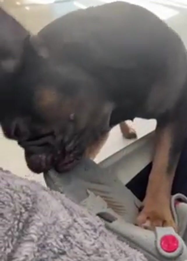 A small, dark-colored French bulldog puppy is shown chewing on a gray Croc shoe