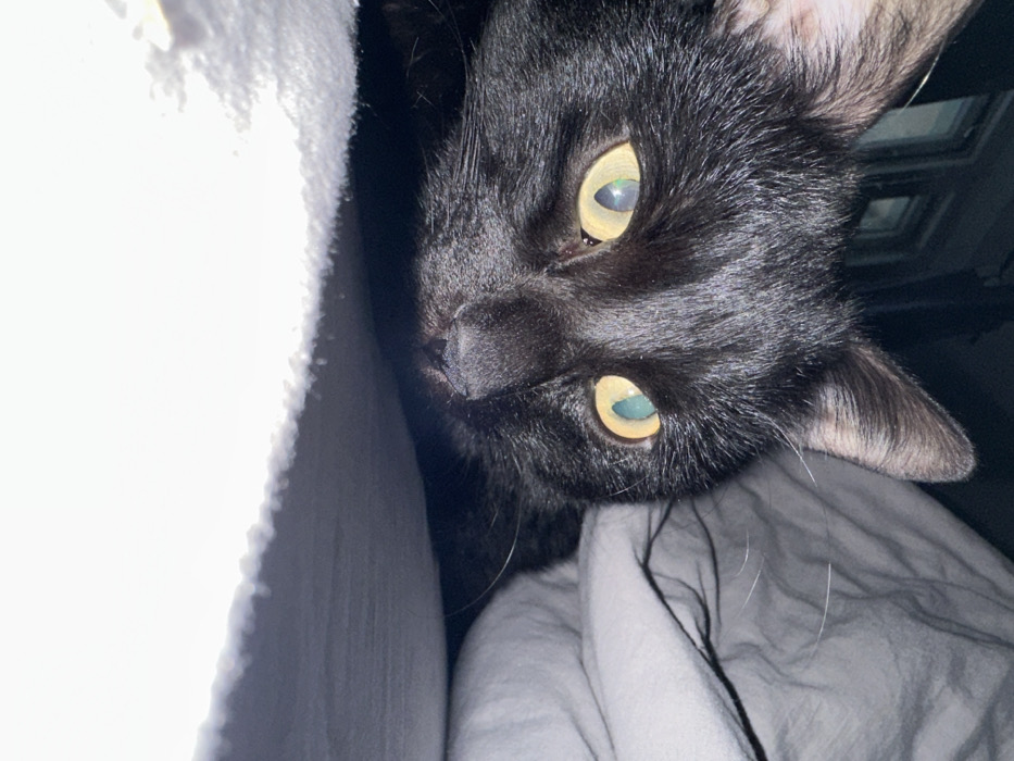 - "A domestic black cat is depicted in a close-up, head-on view, resting on bedding within a location specified as the city of Chaikovsky, Russia" by FM-sRkws2, licensed under CC BY 4.0