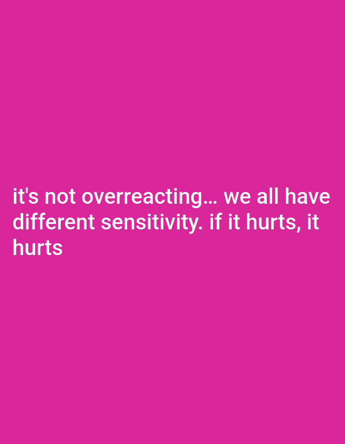 The image is a square with a bright magenta background. In the lower left corner, white text states: "it's not overreacting... we all have different sensitivity. if it hurts, it hurts." The phrase aims to validate individual experiences of pain or hurt, suggesting that different people have varying levels of sensitivity and that one's reaction is valid if it is a response to a painful experience.