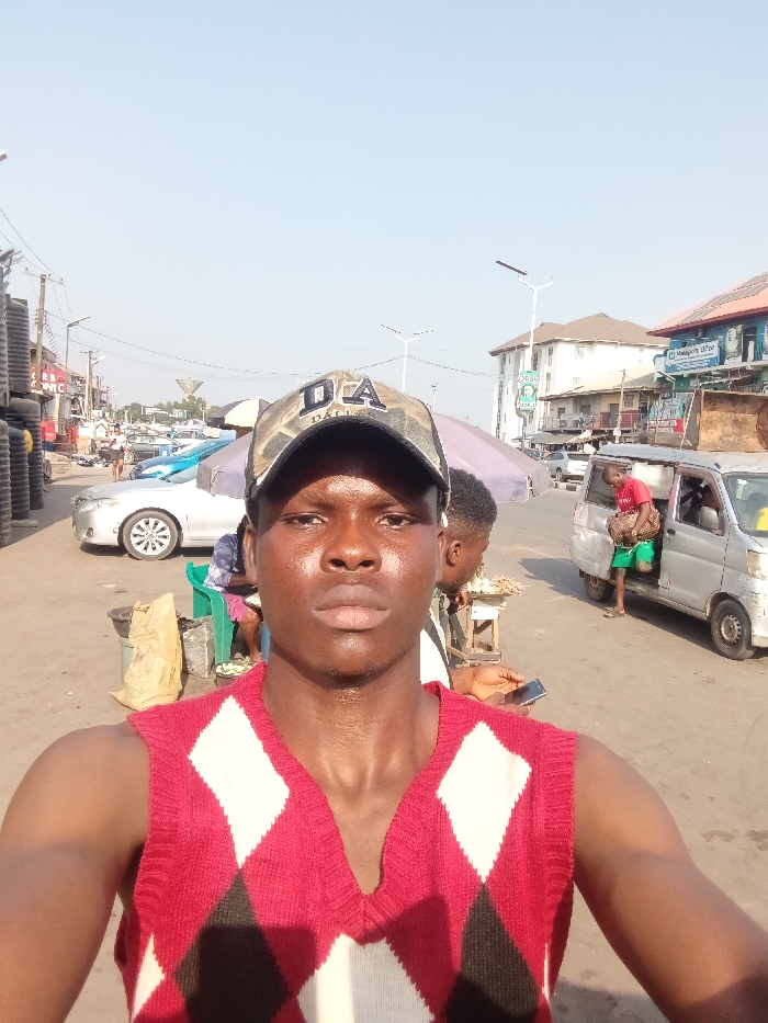 A person wearing a red and white argyle sweater vest and a camouflage baseball cap takes a selfie outdoors. The background shows a bustling street scene with cars, vendors, and pedestrians. A silver minivan is parked nearby, with a person exiting. Tires are stacked high on the left side of the frame. The sky is pale blue, indicating daylight. The person's skin appears slightly glistening.