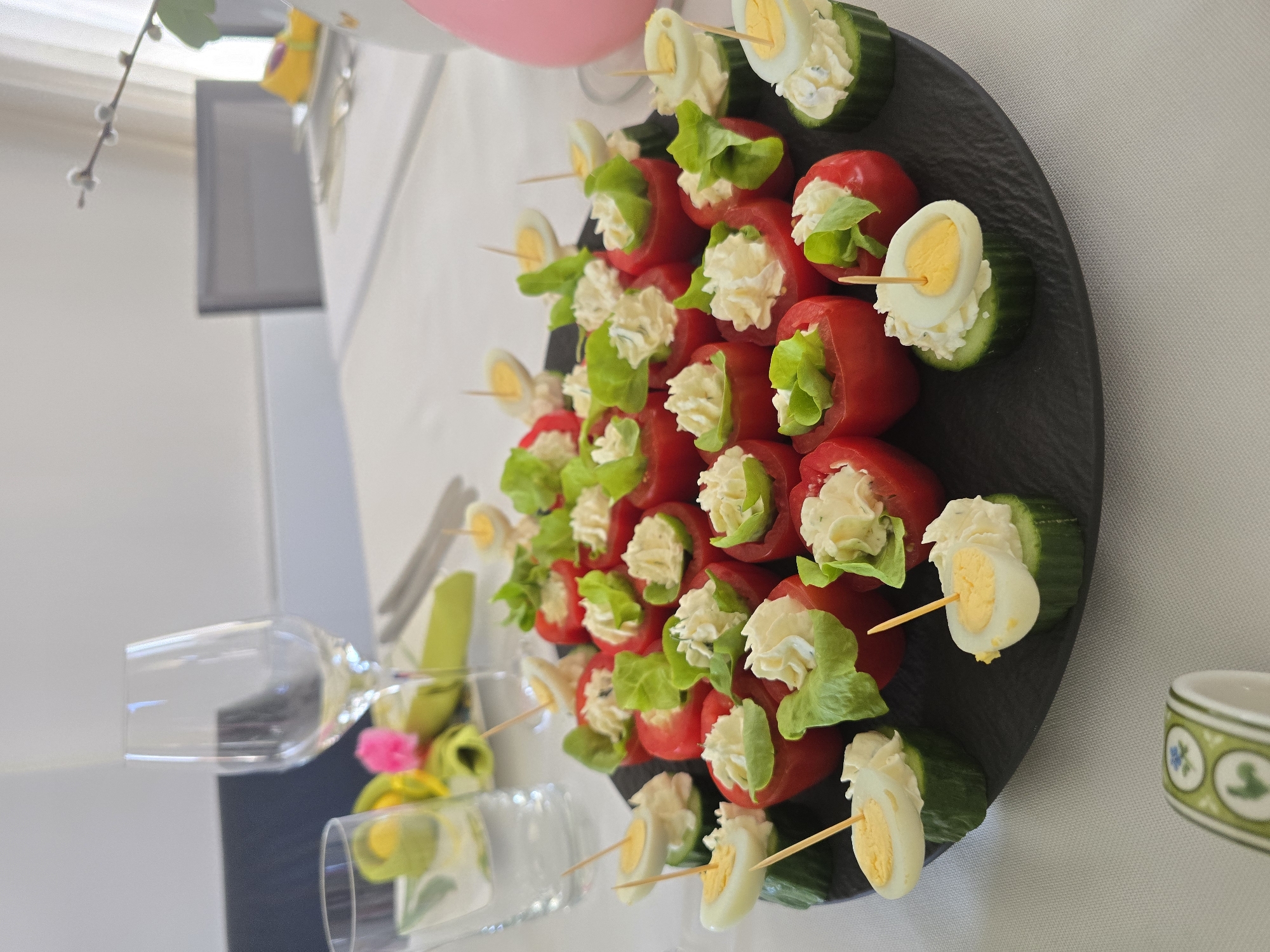 A close-up, medium shot shows a catering table covered with a white tablecloth, laden with hors d'oeuvres, most likely in Bankya, Bulgaria. The hors d'oeuvres are arranged artfully on a dark slate platter. The platter prominently features stuffed cherry tomatoes interspersed with cucumber slices, all held together with toothpicks. The tomatoes are filled with a creamy white filling and garnished with small lettuce leaves. The cucumber slices are topped with half slices of hard-boiled eggs and the same creamy filling. To the left of the platter, two empty wine glasses are visible, partially obscuring a green and yellow floral arrangement. A small ceramic cup decorated with a green floral pattern is situated to the right of the platter. The lighting in the scene is bright and diffused. Other elements visible in the background are a pink balloon and a decorative branch, adding to the celebratory atmosphere of the gathering. A gray lamp is also visible in the background.