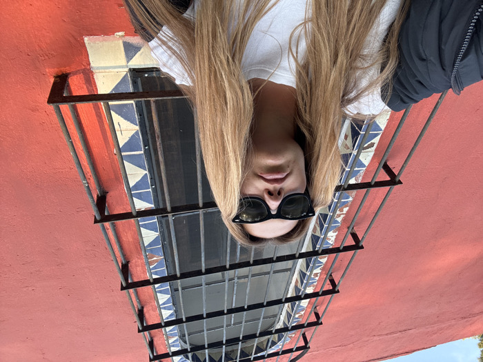 - "A fair-skinned blonde wearing sunglasses and a white top is shown upside down in front of a red wall with a window" by FM-BS4Ql2, licensed under CC BY 4.0