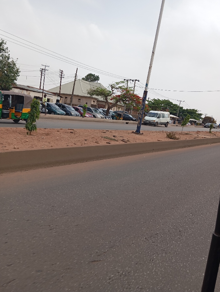 street scene in Kuru Karama, Nigeria, taken from the perspective of a vehicle traveling along the road. The street is paved with asphalt and runs through a residential area. The street is relatively empty, with only a few cars parked along the sides. There are power lines overhead. A white van with a blue stripe is parked at the right edge of the street, and it appears to be a commercial vehicle. Across the street, there is a row of parked cars, along with a green and yellow tricycle-like vehicle with a driver. On the left side of the road, there is a tree, a bush, and a small hill. The sky is cloudy and gray, with the sun shining brightly. The road is a two-lane road with no dividing median. The street is fairly wide. There are buildings visible in the background. The scene is relatively quiet and calm.