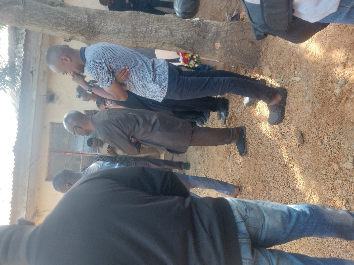 This image, located in Pankshin, Nigeria, captures approximately ten adults gathered outdoors on a reddish-brown gravel and dirt surface under daylight conditions. In the background, a single-story, light-colored building with a corrugated metal roof and a dark-framed window is visible. A tree trunk stands on the right side of the frame. In the foreground, a male subject wears a black long-sleeved shirt and blue jeans, with his back to the viewer. To his right, an older male subject with glasses, dressed in a dark brown tunic and trousers, stands with his arms crossed. Further to the right, another male subject in a black and white patterned short-sleeved shirt is positioned with his right hand covering his mouth. Other individuals, primarily males and one partially visible female, are distributed throughout the mid-ground and background, many wearing dark attire and adopting static postures. A small floral arrangement, featuring red, yellow, and white flowers, rests at the base of the tree trunk on the right. A camera lens is partially visible in the lower right corner. No direct interactions between individuals are discernible; all are standing and appear to be observing.