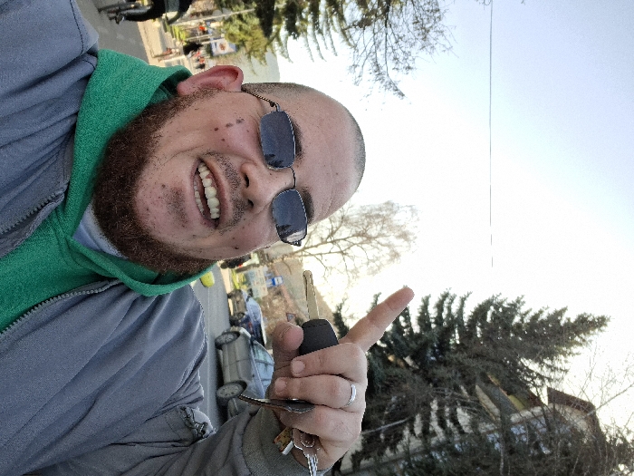 The image captures a male individual taking a selfie outdoors in Velingrad, Bulgaria