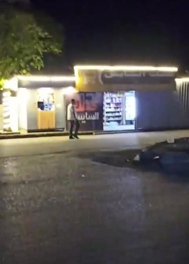 man walking past a shop at night. The shop has bright lights and a sign with Arabic writing. The man is wearing a light-colored shirt and dark pants. The ground is paved and there are some trees in the background. The video is shot from a distance.
