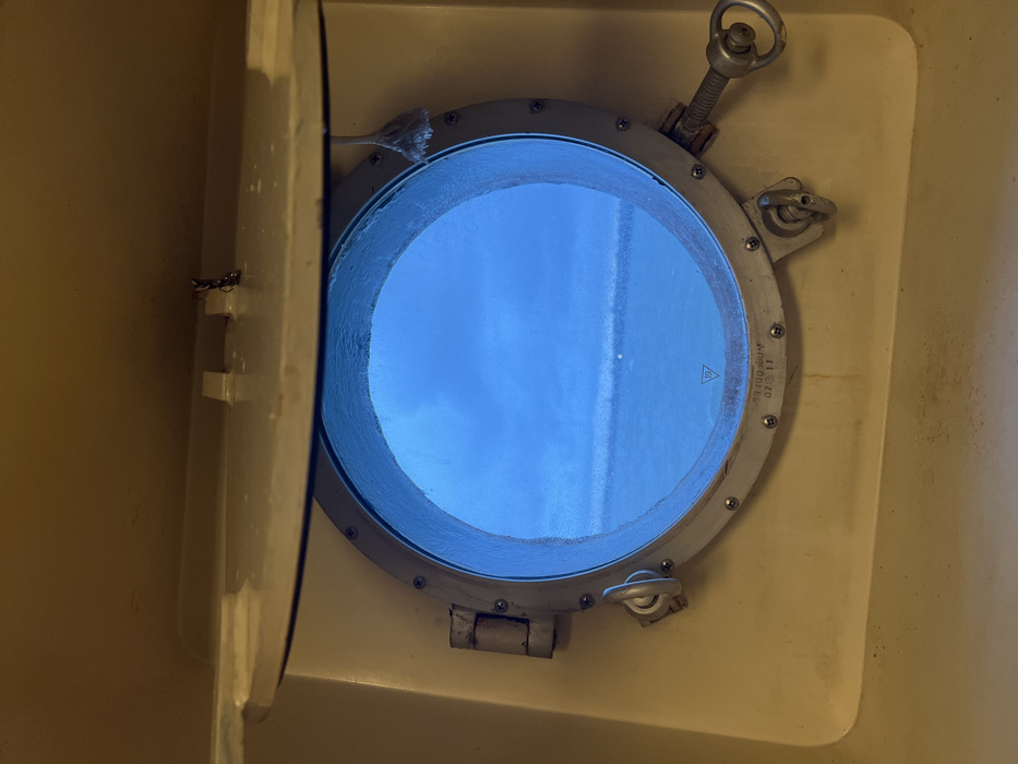 A round porthole, partially open, is set into a light beige wall