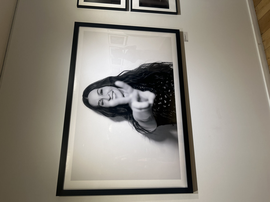 A black and white photograph of a woman with long, dark, wavy hair is framed in black and hangs on a white wall. She is smiling and giving a peace sign with her right hand. She's wearing a sparkly top. There are two additional framed photographs above it. The white wall appears to be slightly off-white. The photo is rotated counter-clockwise, with the woman's head positioned towards the upper left.