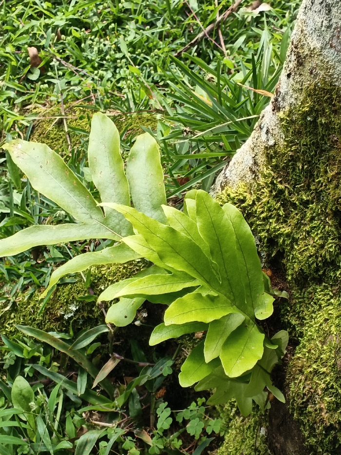 The image displays a close-up, ground-level view of lush green vegetation in Situm, Papua New Guinea. On the right, a section of a tree trunk, heavily textured with dark green moss, rises vertically. Adjacent to the trunk's base, a vibrant cluster of epiphytic ferns with multiple, bright green, elongated fronds emerges. To the left, a separate fern, characterized by broader, deeply lobed, light green fronds, extends across the foreground. The surrounding ground cover consists of various small green plants, including fine grasses and small clover-like leaves, interspersed with patches of moss and minor brown organic matter. No individuals, actions, or interactions are present.