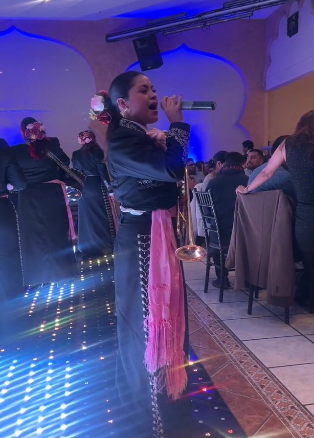 A woman in a black mariachi outfit with a pink sash and flower in her hair sings into a microphone while standing on a light-up dance floor at an event. Behind her are other mariachi musicians in similar attire, and in the background are people seated at tables in what appears to be a restaurant or banquet hall. The lighting in the room is predominantly blue.