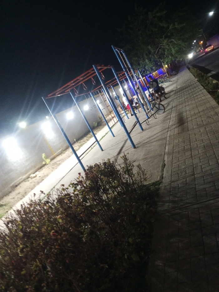 The image depicts an outdoor recreational area at night in Tinaquillo, Venezuela. The scene is illuminated by multiple bright artificial lights. In the immediate foreground, a dense, dark green and brown shrub obscures the lower portion of the frame. Behind this, a light-colored concrete or stucco wall runs horizontally across the left midground, fitted with at least three intense, unshielded lights that cast significant glare and illuminate the adjacent ground. Centered in the midground is a calisthenics or playground structure. It features multiple vertical blue metal poles supporting an overhead framework of red metal bars. Several rings hang from these bars, and a ladder-like component is visible. At least two individuals are present near this equipment: one person, dressed in a light-colored top and red shorts, stands near the center of the structure, while another figure is partially visible further to the right. A dark-colored bicycle is parked or leaning near the right side of the equipment. To the right of the exercise area, a paved sidewalk, constructed from rectangular paver bricks, extends diagonally towards the upper right. Beyond the sidewalk and equipment, mature trees are visible against the dark night sky. In the far background, a paved road or street is discernable, featuring multiple streetlights and the visible headlights and taillights of at least two vehicles, indicating traffic. The overall perspective is slightly tilted to the right.