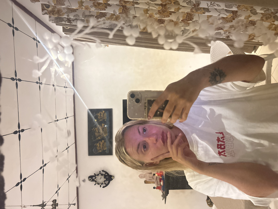A fair-skinned individual with blonde hair is depicted in a mirror selfie taken within an indoor room in Nilwella, Sri Lanka
