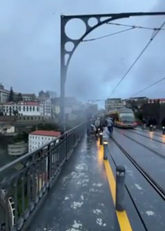 view from a bridge on a cloudy day. There are people walking along the bridge and a tram is visible on the tracks. The bridge has a metal railing on the left side. The cityscape can be seen in the background, obscured by the weather.