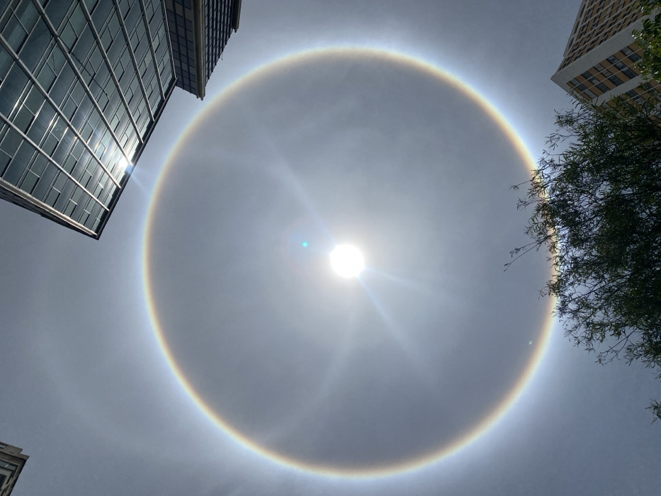 A prominent 22-degree solar halo encircles the bright sun in a hazy sky over La Paz, Bolivia