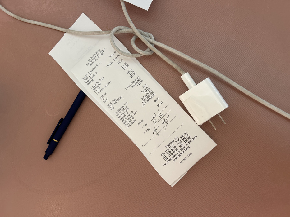 The image displays an overhead view of several objects arranged on a smooth, uniform light reddish-brown surface. A white paper receipt from "Kellogg's Diner, 518 Metropolitan Avenue, Brooklyn, NY 11211, United States" is positioned slightly left of center, angled upwards to the right. The receipt is dated "11/8/23 12:42 PM" and details an order for two guests, served by "Francisco S.". Ordered items include "1 Egg Any Style ($12.00)", "1 Scrambled ($14.00)", "1 Buttermilk Pancakes ($14.00)", and "1 Ricotta Pancakes ($14.00)". The printed subtotal is "$54.00", tax is "$3.54", and the printed total is "$57.54". A "DEBIT MASTERCARD" transaction for "$40.82" is listed. Handwritten entries on the receipt include "57.54" next to the first "Total", "20%" and "$11.51" next to "+Tip:", and "$69.05" next to the second "Total", followed by a handwritten signature. The bottom of the receipt states "Merchant Copy". Above and to the left of the receipt, a dark blue pen with a gold central band rests diagonally. To the right of the receipt, a white, two-pronged USB power adapter is visible, connected to a light grey braided cable. The cable is partially coiled in a loose knot-like formation and extends out of frame to the right.