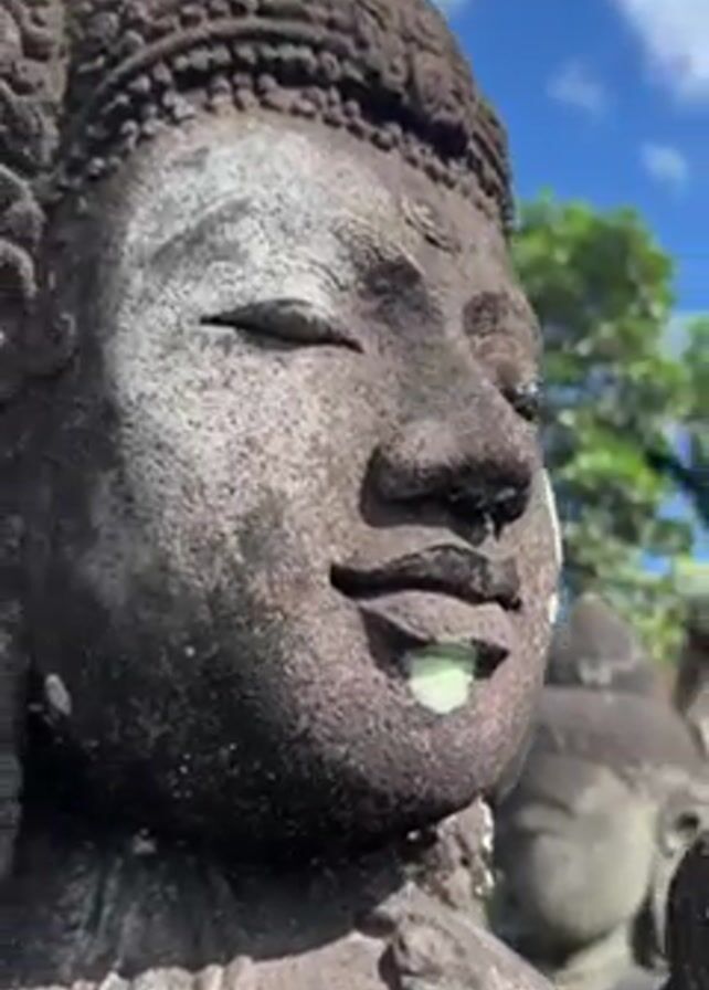 close-up of a stone sculpture depicting three faces. The faces have their eyes closed and a serene expression. The sculpture is aged and covered in moss. The background includes a blue sky with white clouds and some greenery. A structure resembling a building is also visible in the background. There are sounds of traffic during the recording.