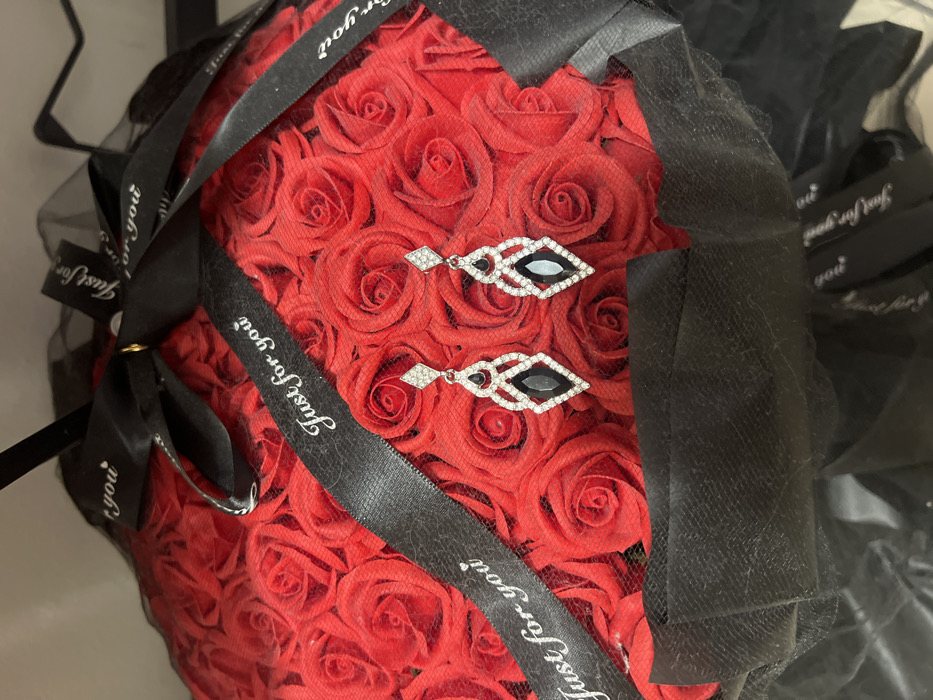 The scene depicts a close-up, overhead view of a gift arrangement, located in Petrich, Bulgaria. A bouquet composed entirely of numerous tightly packed red artificial roses serves as the primary base. The roses are wrapped at the bottom by a black mesh material and further adorned with multiple strands of black ribbon. Several ribbons are visible across the top of the roses, each bearing white text repeating the phrase "Just for you." Resting on the surface of the red roses, slightly off-center towards the right, is a pair of matching dangle earrings. Each earring features a silver-toned setting with an elongated, ornate design, incorporating small clear stones and a central, larger, black faceted stone in a marquise or elongated diamond shape. The background is indistinct and dark, suggesting an indoor setting. There are no people visible in the image.