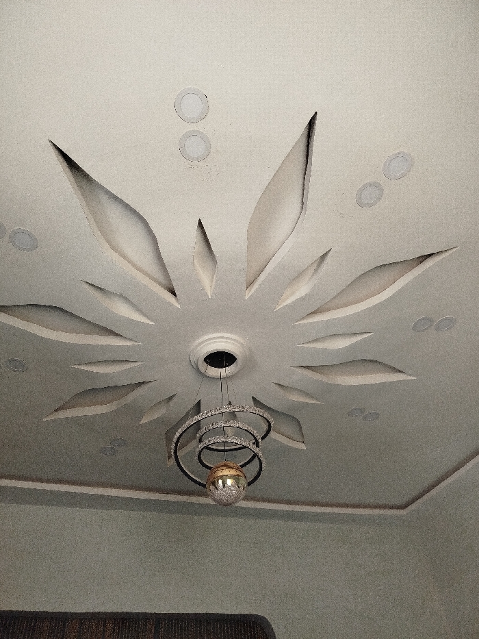 The image displays an interior ceiling within a structure located in Yelwa, Nigeria. The white false ceiling features a prominent central circular recess from which a decorative chandelier is suspended. The chandelier comprises two dark, spiral-shaped rings, embellished with clear reflective elements, positioned above a spherical light fixture that is split into a golden upper half and a mirrored lower half. Surrounding the central recess, the ceiling surface exhibits multiple radially arranged, irregular, leaf-like depressions of varying sizes. Additionally, several pairs of circular recessed light fixtures are integrated into the ceiling. A portion of a light-toned wall and a dark, textured object are partially visible along the bottom edge of the frame. No people or specific actions are depicted.