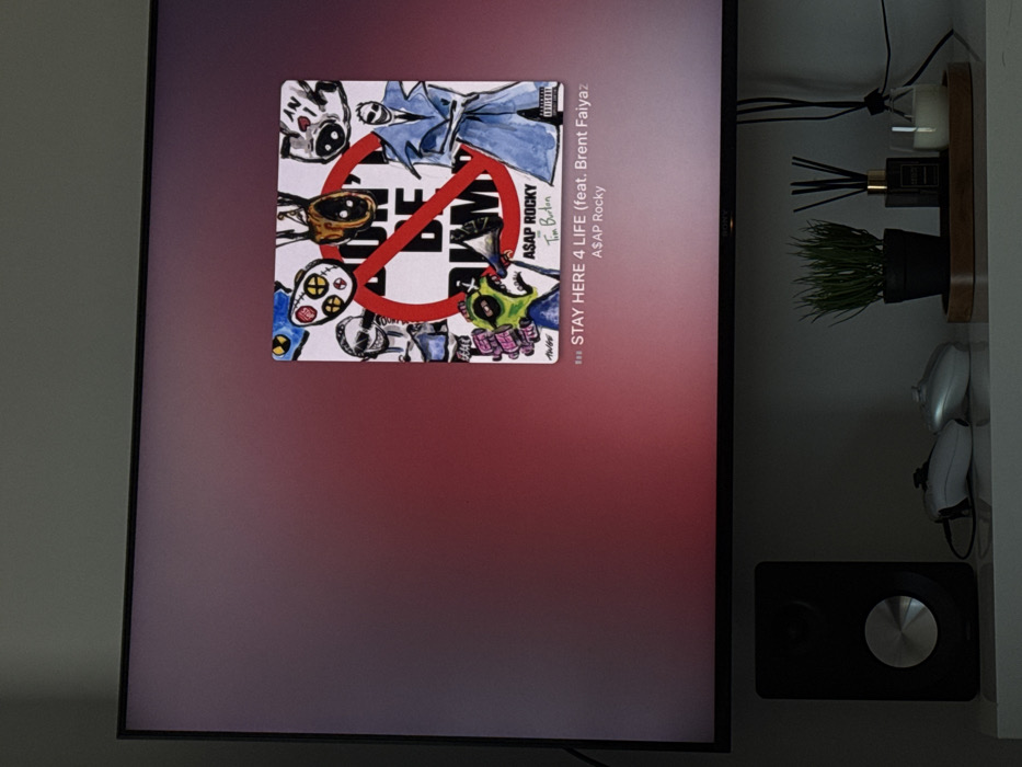 The image depicts an indoor scene focused on a television screen and a shelf below it. The television screen displays album art for "DON'T BE DUMB" by A$AP Rocky (featuring Tim Burton), characterized by a colorful, cartoonish illustration including various stylized figures, a prominent red "no" symbol, and an "Advisory" label. Below the album art, the song title "▪︎▪︎▪︎ STAY HERE 4 LIFE (feat. Brent Faiyaz)" by "ASAP Rocky" is visible. The screen exhibits a gradient background transitioning from reddish-purple to a lighter red. Below the television, a white media console or shelf is present. On the left side of the shelf, a black rectangular speaker with a silver circular element is situated. To its right, two white video game controllers, one connected by a black cable, rest on the surface. Further to the right, a small wooden tray holds a miniature black potted plant with green, grass-like foliage, a dark rectangular reed diffuser with a gold-colored cap, and a clear glass candle holder containing a white candle. Black electrical cables are visible behind the shelf and descending from the television. The background wall is a plain, light color. No individuals are present in the scene. The specific location within Plovdiv, Bulgaria, cannot be determined from the visual information provided.