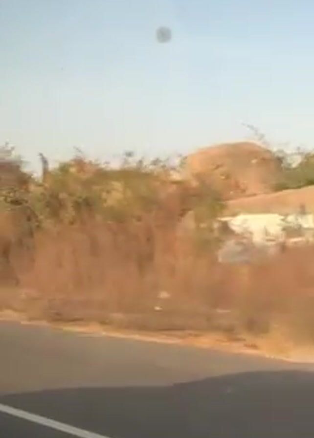 The video depicts a landscape seen from a moving vehicle. A paved road with a white dividing line is visible in the foreground. On the right side of the road is a dry, rocky landscape with sparse vegetation. The sky is clear and light blue. The camera angle is slightly elevated and static, capturing the view as the vehicle moves forward. There are some imperfections on the windshield.